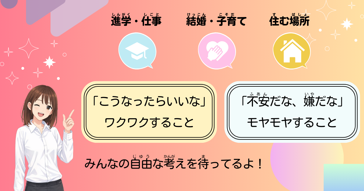 これまでの3つの質問をふまえて、 あなたが将来を考える上で一番ワクワクすること or 一番モヤモヤすることを自由に教えてください。