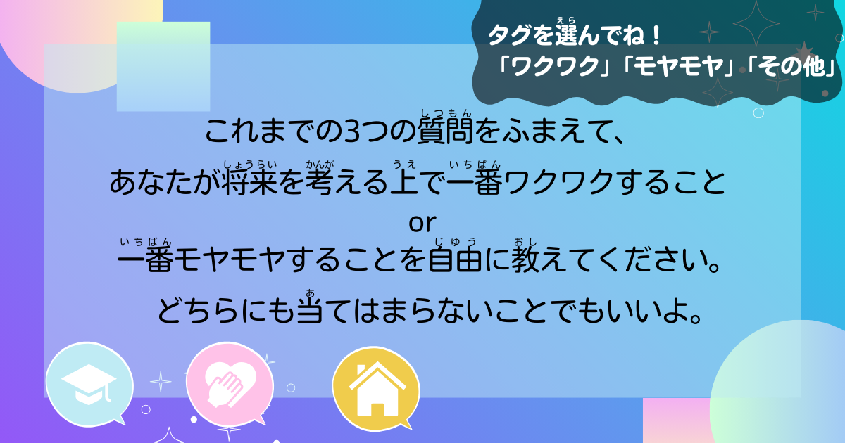 これまでの3つの質問をふまえて、 あなたが将来を考える上で一番ワクワクすること or 一番モヤモヤすることを自由に教えてください。