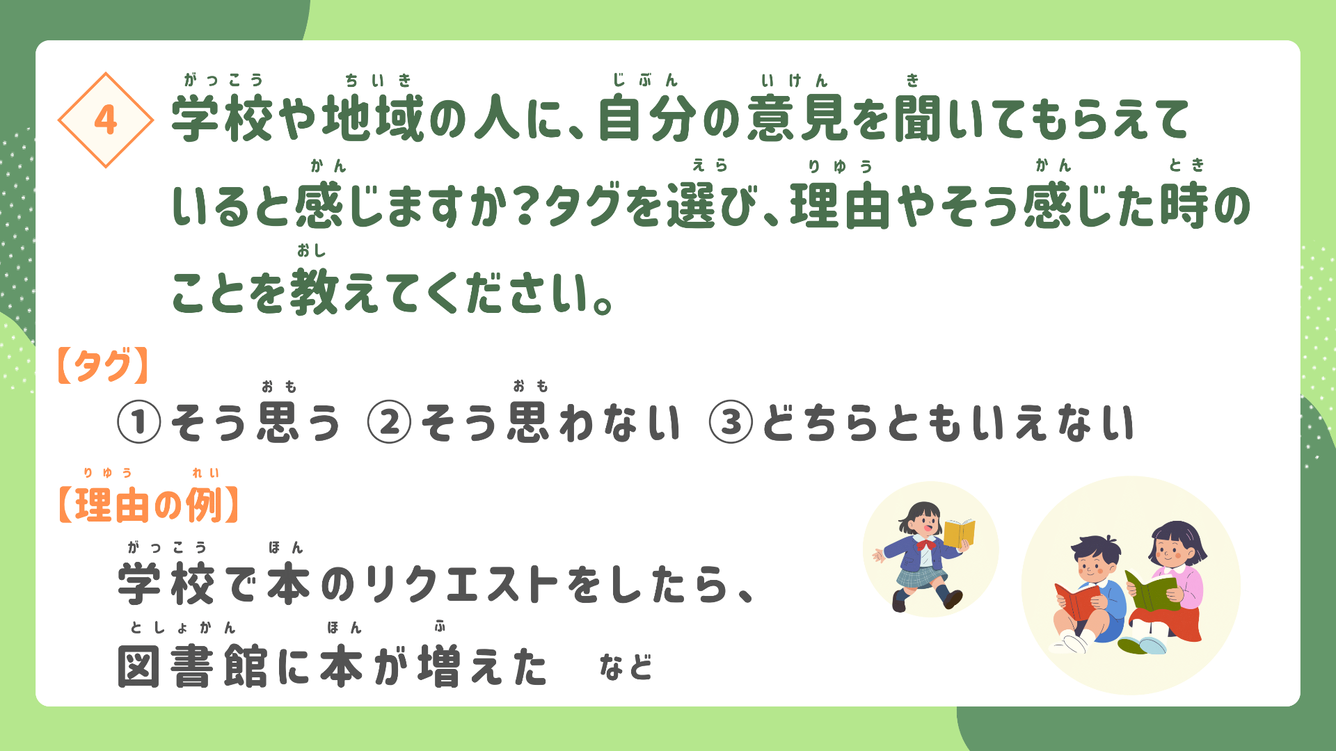学校や地域の人に、自分の意見を聞いてもらえているとかんじますか?タグを選び、理由やそう感じた時のことを教えてください。