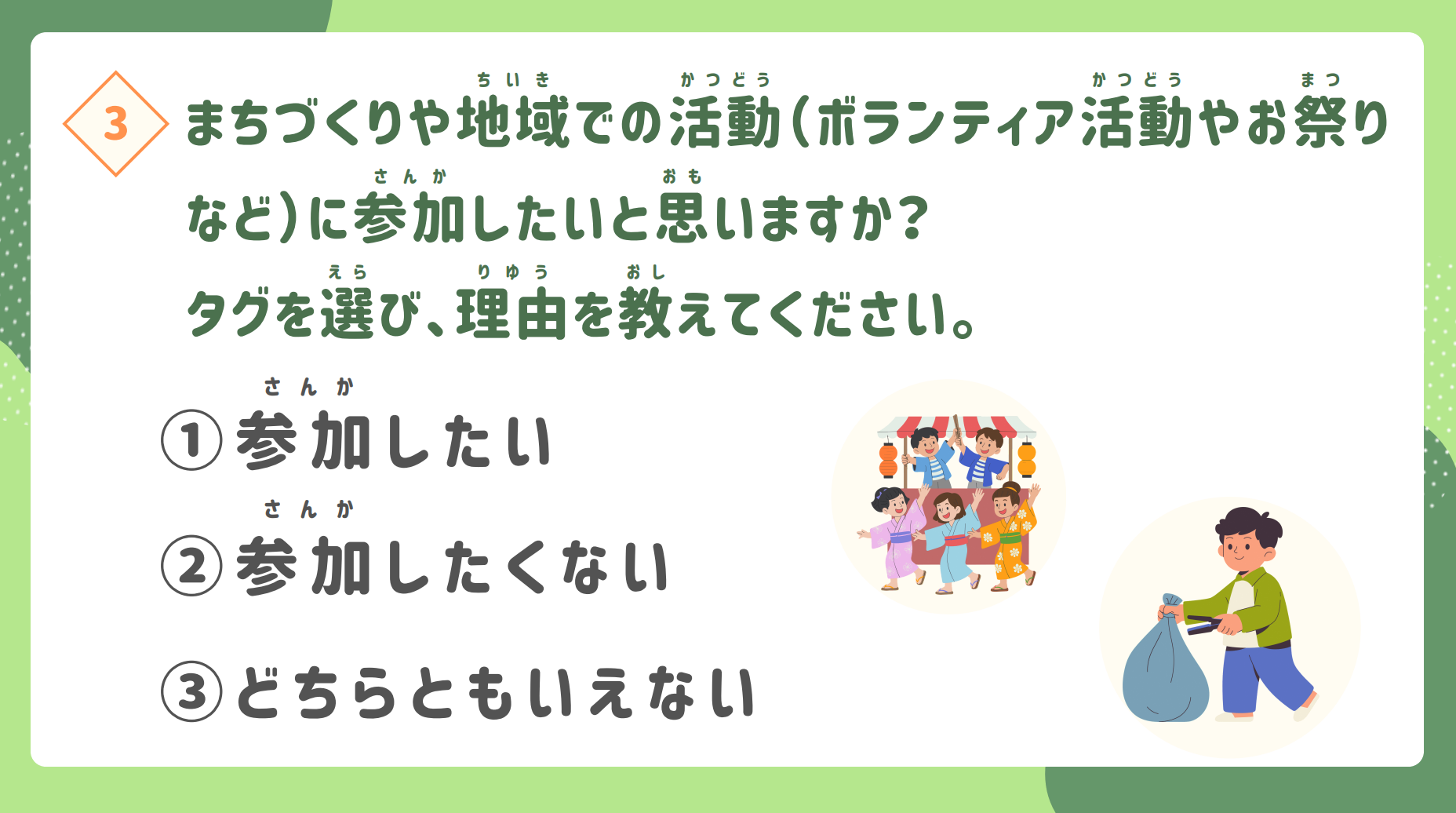 まちづくりや地域での活動(ボランティア活動やお祭りなど)に参加したいと思いますか?タグを選び、理由を教えてください。