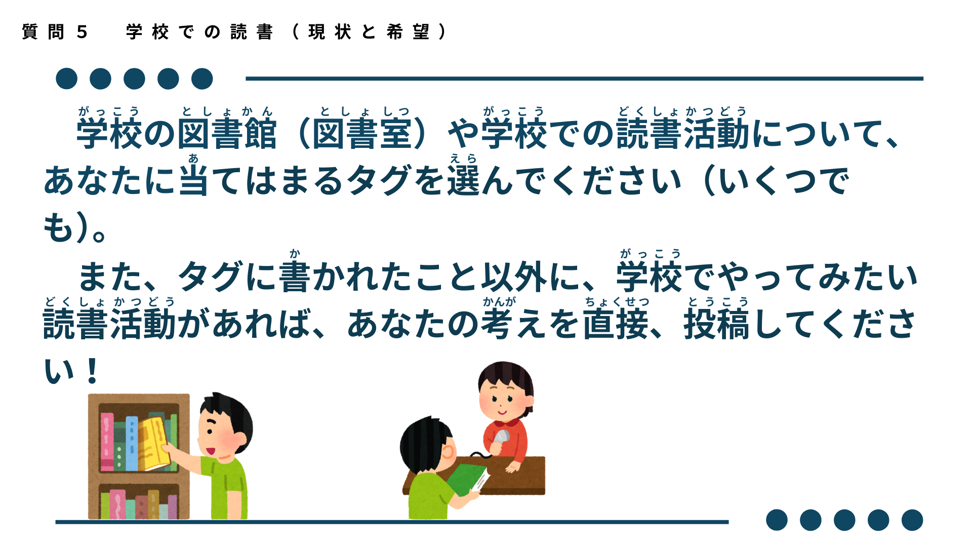 学校の図書館(図書室)や学校での読書活動について、あなたに当てはまるタグを選んでください(いくつでも)。また、タグに書かれたこと以外に、学校でやってみたい読書活動があれば、あなたの考えを直接、投稿してください!