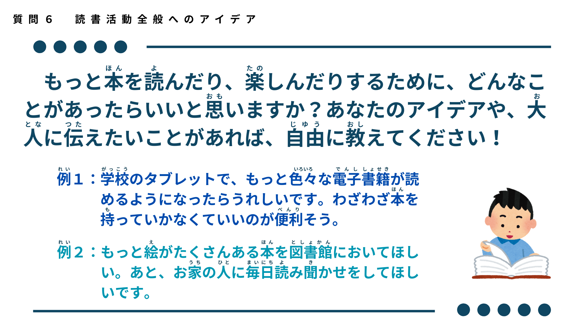 もっと本を読んだり楽しんだりするために、どんなことがあったらいいと思いますか?あなたのアイデアや、大人に伝えたいことがあれば、自由に教えてください!